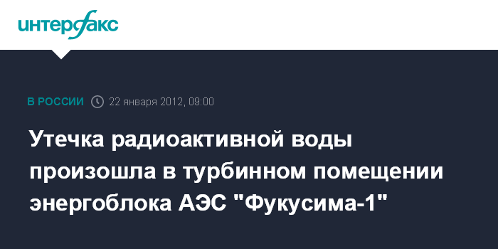 Токио. 22 января. INTERFAX.RU - В турбинном помещении энергоблока N2 аварийной атомной электростанции "Фукусима-1" была обнаружена высокорадиоактивная вода, на устранение утечки ушло менее часа, сообщает в воскресенье японская телерадиокомпания NHK.