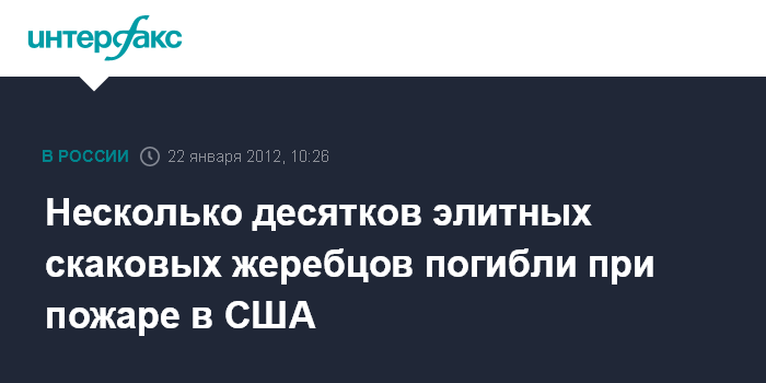 Вашингтон. 22 января. INTERFAX.RU - Жертвами пожара в конюшнях американского штата Нью-Джерси в ночь на воскресенье стали 22 элитных скаковых жеребца, каждый из которых стоимостью в десятки тысяч долларов США, сообщил американской газете "Стар леджер" хозяин конюшен.
