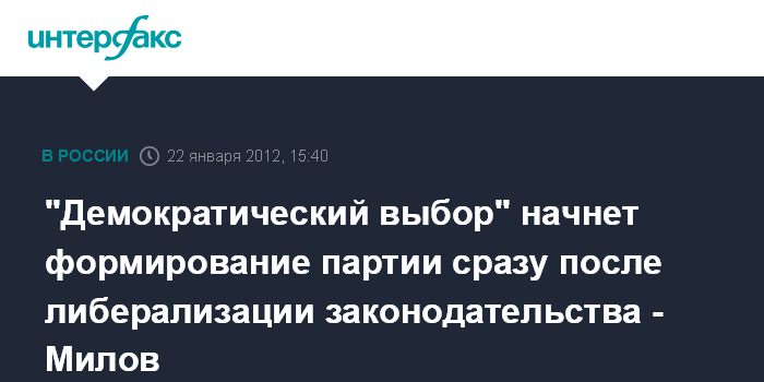 Москва. 22 января. INTERFAX.RU - Объединение "Демократический выбор", которое возглавляет Владимир Милов, на своем общем собрании в воскресенье приняло решение преобразоваться в партию.