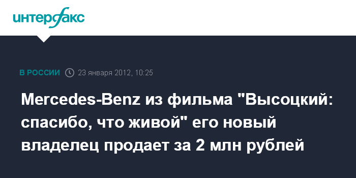 Кемерово. 23 января. INTERFAX.RU - Кемеровский пенсионер Анатолий Плотников, выигравший в конце прошлого года в викторине автомобиль, участвовавший в съемках фильма "Высоцкий: спасибо, что живой", продает его за 2 млн рублей.