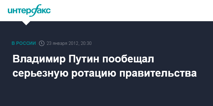 Кисловодск. 23 января. INTERFAX.RU - Премьер-министр РФ Владимир Путин обещает серьезную ротацию правительства России в случае победы на выборах президента РФ. "Разумеется, должна быть ротация и ротация серьезная, это очевидный факт, и она будет", - заявил Путин на форуме народов Юга России.