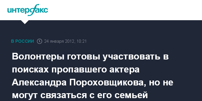 Москва. 24 января. INTERFAX.RU - Волонтеры движения "Лиза Алерт" готовы участвовать в поисках пропавшего актера Александра Пороховщикова и пытаются связаться с его родственниками. "Мы сейчас выясняем информацию. Вчера, когда это попало в новости, мы пытались выйти на семью, на родственников, но пока не получилось, телефоны не отвечали. Так что в процессе", - заявил представитель движения агентству "Интерфакс" во вторник утром.