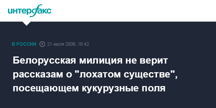 Минск. 21 июля. INTERFAX.RU - Жители Гродненской области Белоруссии рассказывают о странном лохматом существе, которое якобы видели в кукурузных полях, однако в милиции называют все это домыслами.