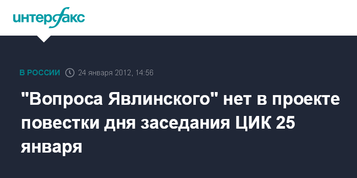 Москва. 24 января. INTERFAX.RU - ЦИК России на своем ближайшем заседании в среду, 25 января, видимо, не будет рассматривать вопрос относительно отказа в регистрации одному из основателей партии "Яблоко" Григорию Явлинскому в качестве кандидата на пост президента РФ.