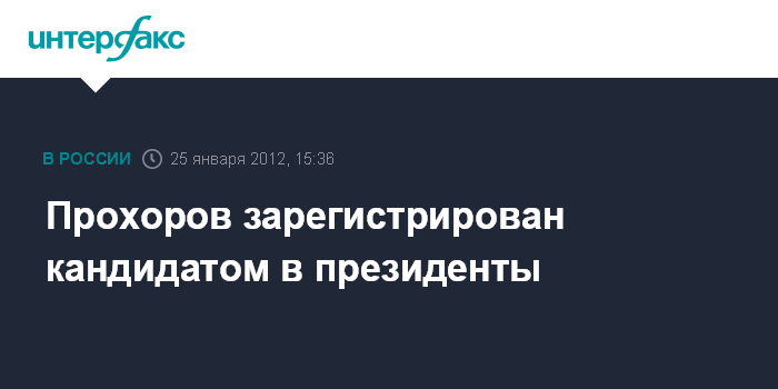 Москва. 25 января. INTERFAX.RU - Предприниматель Михаил Прохоров получил в Центризбиркоме регистрацию в качестве кандидата на должность президента РФ, таким образом, он стал пятым претендентом на высший государственный пост.
