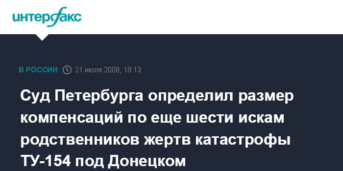 Санкт-Петербург. 21 июля. ИHТЕРФАКС СЕВЕРО-ЗАПАД - Московский районный суд Петербурга в понедельник вынес решения по шести искам о компенсациях от родственников жертв авиакатастрофы ТУ-154 под Донецком в августе 2006 года.
