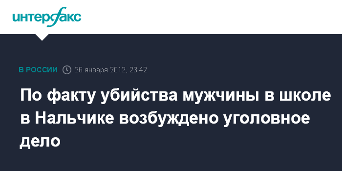Москва. 26 января. INTERFAX.RU - В Кабардино-Балкарской Республике возбуждено уголовное дело по факту убийства мужчины в здании школы в городе Нальчике, сообщил в четверг вечером СК РФ.