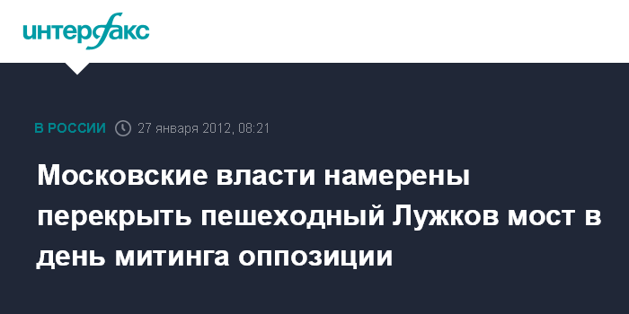 Москва. 27 января. INTERFAX.RU - Лужков мост в центре Москвы может быть закрыт 4 февраля во время митинга оппозиции "За честные выборы" на Болотной площади в целях безопасности, сообщил в четверг журналистам заместитель мэра столицы Александр Горбенко.