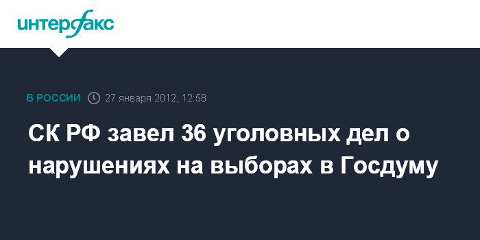 Москва. 27 января. INTERFAX.RU - По результатам рассмотрения сообщений о нарушениях в ходе парламентских выборов Следственный комитет РФ возбудил 36 уголовных дел, сообщил глава ведомства Александр Бастрыкин.