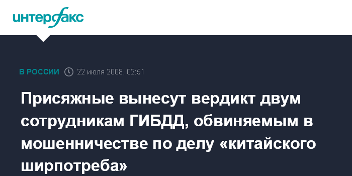Москва. 22 июля. ИНТЕРФАКС - Коллегия присяжных в Мосгорсуде во вторник, как ожидается, вынесет вердикт в отношении двух сотрудников ГИБДД - Сергея Богородицкого и Дмитрия Гончаренко, обвиняемых в мошенничестве и взяточничестве по "делу китайского ширпотреба".