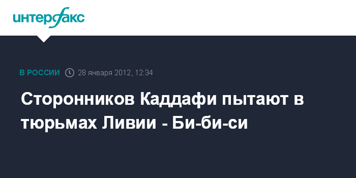 Лондон. 28 января. INTERFAX.RU - В ливийских тюрьмах продолжают применять пытки против сторонников свергнутого президента Муамара Каддафи, передает в субботу британская телерадиокорпорация Би-би-си. Соответствующие свидетельства корреспонденты Би-би-си получили от заключенных, находящихся в тюрьме ливийского города Мисурата.