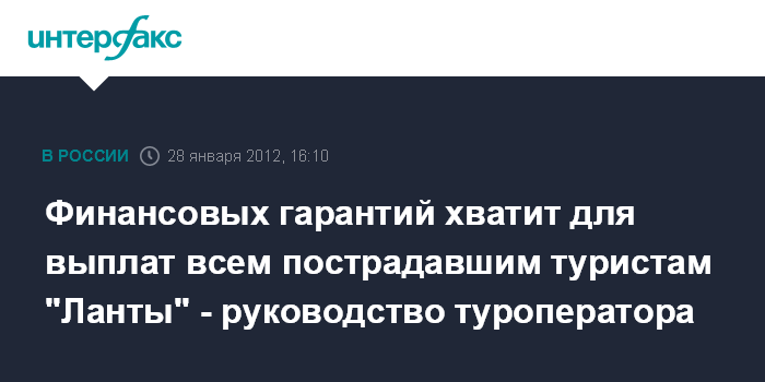 Москва. 28 января. INTERFAX.RU - Руководство туристической компании "Ланта-Тур Вояж" рассчитывает, что финансовых гарантий в размере 100 млн руб. должно хватить на всех пострадавших туристов, сообщила "Интерфаксу" пресс-секретарь Российского союза туриндустрии Ирина Тюрина.