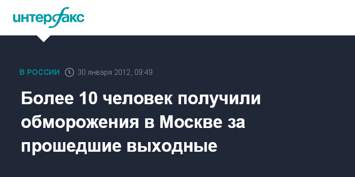 Москва. 30 января. INTERFAX.RU - За прошедшие выходные в Москве от переохлаждения и обморожения пострадали 14 человек, сообщил "Интерфаксу" источник в медицинских кругах столицы.