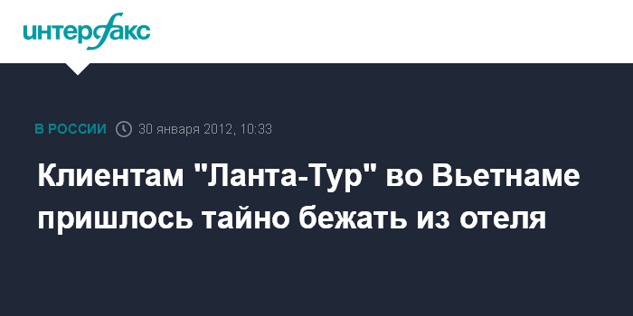 Москва. 30 января. INTERFAX.RU – Клиентам туристической компании "Ланта-Тур", заявившей о приостановке деятельности, находящимся во Вьетнаме, пришлось бежать из отеля, бросив вещи, пишут в Сети