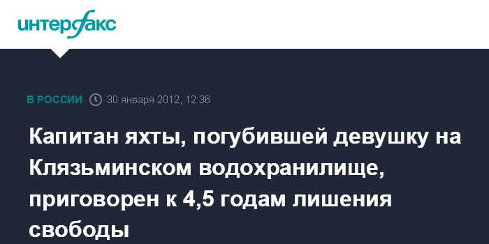 Москва. 30 января. INTERFAX.RU - Мытищинский городской суд приговорил к 4,5 годам заключения капитана яхты Сергея Марченко, признанного виновным в том, что под винтами управляемого им судна летом 2010 года погибла 25-летняя Олеся Иванова.