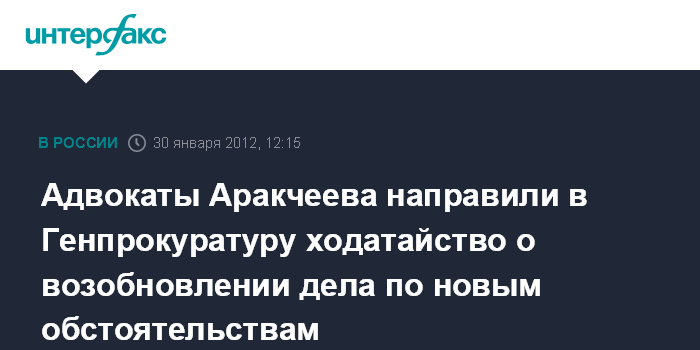 "Подали в Генпрокуратуру ходатайство о возобновлении дела по новым обстоятельствам", - сказал "Интерфаксу" адвокат Аракчеева Дмитрий Аграновский.