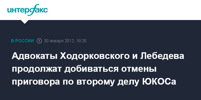 Москва. 30 января. INTERFAX.RU - Защита бывших руководителей НК "ЮКОС" Михаила Ходорковского и Платона Лебедева продолжит бороться за отмену приговора по их второму делу в Верховном суде РФ.