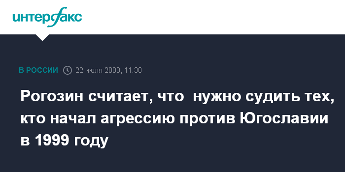 Москва. 22 июля. INTERFAX.RU - Постпред России при НАТО Дмитрий Рогозин заявил, что в случае начала судебного процесса над бывшим лидером боснийских сербов Родованом Караджичем необходимо привлечь к ответственности и инициаторов агрессии 1999 г. против бывшей Югославии.
