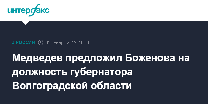 Москва. 31 января. INTERFAX.RU - Президент Дмитрий Медведев внес на рассмотрение Волгоградской областной Думы кандидатуру нового главы администрации Волгоградской области. Наделить полномочиями главы администрации Медведев предлагает Сергея Боженова, сообщила во вторник пресс-служба Кремля.