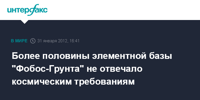Воронеж. 31 января. INTERFAX.RU - Свыше половины микросхем на борту межпланетной станции "Фобос-Грунт" не были предназначены для использования в космическом полете, заявил на пресс-конференции во вторник в Воронеже глава комиссии по расследованию причин аварии космического аппарата Юрий Коптев.