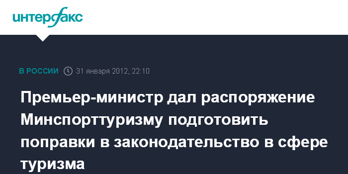 Тамбов. 31 января. INTERFAX.RU - Премьер РФ Владимир Путин поручил Минспорттуризму совместно с другими заинтересованными органами подготовить поправки в законодательство, позволяющие в дальнейшем избежать ситуаций, подобных возникшей вокруг туроператора "Ланта-Тур Вояж".