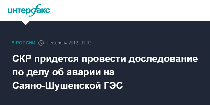 Москва. 1 февраля. INTERFAX.RU - Генпрокуратура РФ вернула в Следственный комитет уголовное дело об аварии на Саяно-Шушенской ГЭС для дополнительного расследования в связи с изменением УК РФ, сообщил официальный представитель СК РФ Владимир Маркин.