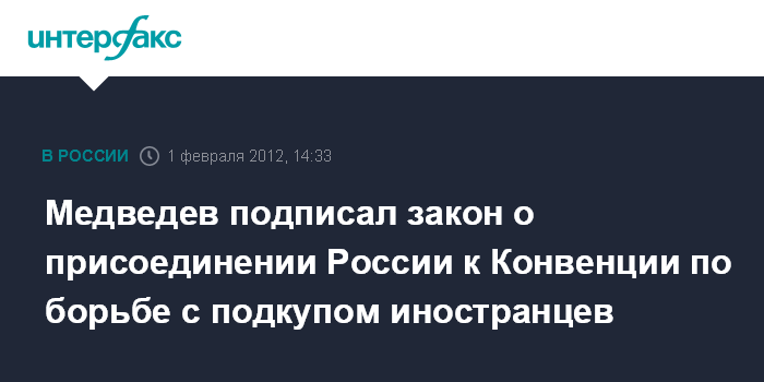 Горки. 1 февраля. INTERFAX.RU - Президент РФ Дмитрий Медведев сообщил, что подписал закон "О присоединении Российской Федерации к Конвенции по борьбе с подкупом иностранных должностных лиц при осуществлении международных коммерческих сделок". "Считаю, что присоединение является исключительно важным и позволит гармонизировать международные стандарты борьбы с коррупцией и нашу правовую систему", - отметил Медведев в среду на совещании по вопросам судебной системы.
