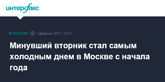 Москва. 1 февраля. INTERFAX.RU - Вторник, 31 января, стал самым холодным днем этого года с минимальной температурой -21,9 градуса, максимальной температурой - 15,9 градуса, сообщает интернет-портал Метеоновости.ру.