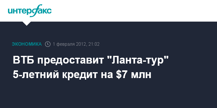 ВТБ предоставит "Ланта-тур" 5-летний кредит на $7 млн