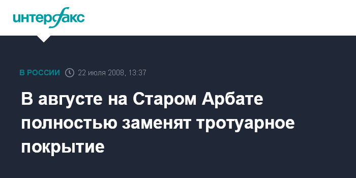 Москва. 22 июля. INTERFAX.RU - Капитальный ремонт дорожного покрытия на Старом Арбате будет завершен к 15 августа, сообщил "Интерфаксу" начальник центра общественных связей ГУП "Доринвест" Сергей Чекин во вторник.