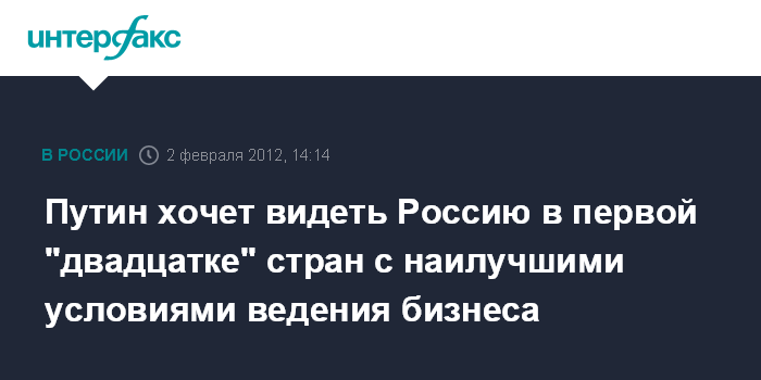 Москва. 2 февраля. INTERFAX.RU - Россия в ближайшие годы должна подняться со 120-го на 20-е место по условиям ведения бизнеса, заявил премьер-министр РФ Владимир Путин, выступая в четверг на инвестфоруме "Россия - 2012".