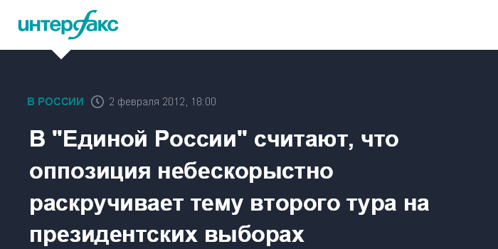 Москва. 2 февраля. INTERFAX.RU - В руководстве "Единой России" считают, что оппозиция заинтересована раскручивать тему второго тура президентских выборов, так как рассчитывает получить преференции от власти.