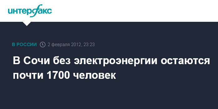 Сочи. 2 февраля. INTERFAX.RU - Жители сельских округов Сочи продолжают оставаться без электроснабжения, сообщила агентству "Интерфакс - Юг" руководитель пресс-службы ОАО "Кубаньэнерго" Оксана Левицкая. По ее данным, на 21:00 мск в Сочи без света остаются 1680 сельских жителей.