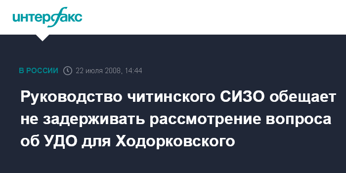 Чита. 22 июля. INTERFAX.RU - Начальник читинского следственного изолятора обещает своевременно предоставить Ингодинскому райсуду характеристику экс-главы НК "ЮКОС" Михаила Ходорковского для рассмотрения вопроса о его условно-досрочном освобождении.