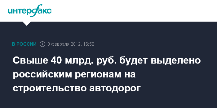 3 февраля. INTERFAX.RU - Правительство РФ в 2012-2014 гг. выделит регионам из федерального бюджета более 40 млрд. руб. на софинансирование строительства автомобильных дорог. Премьер РФ Владимир Путин подписал соответствующее распоряжение 27 января.