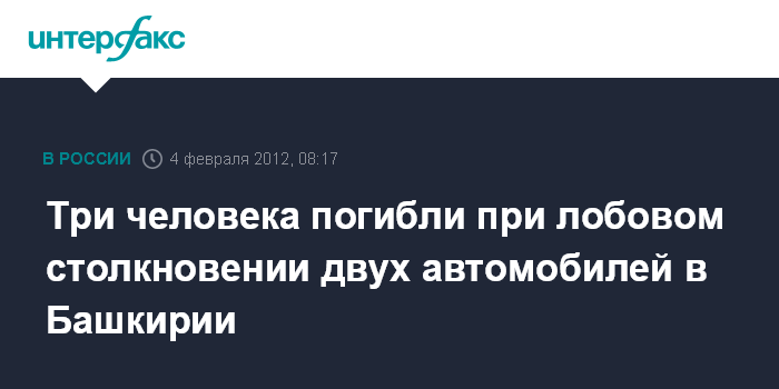 Уфа. 4 февраля. ИНТЕРФАКС-ПОВОЛЖЬЕ - В Салаватском районе Башкирии в результате столкновения иномарки и "Жигулей" погибли три человека, сообщили в субботу агентству "Интерфакс-Поволжье" в пресс-службе республиканского ГИБДД.