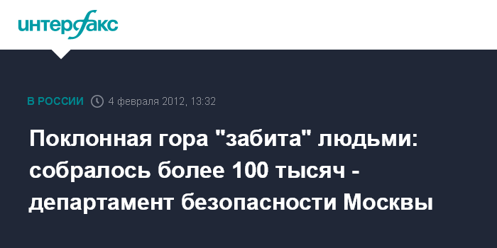 Москва. 4 февраля. INTERFAX.RU - Более 100 тысяч человек пришли на митинг на Поклонную гору, сообщил журналистам в субботу представитель столичного департамента региональной безопасности. "Вся Поклонная гора забита людьми, собралось более 100 тысяч человек", - сказал собеседник агентства.