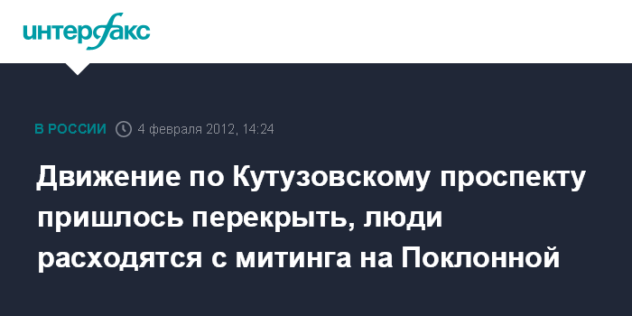 Москва. 4 февраля. INTERFAX.RU - Движение по Кутузовскому проспекту полностью снято из-за массового оттока участников митинга на Поклонной горе, сообщили "Интерфаксу" в пресс-службе ГУ МВД России по Москве.
