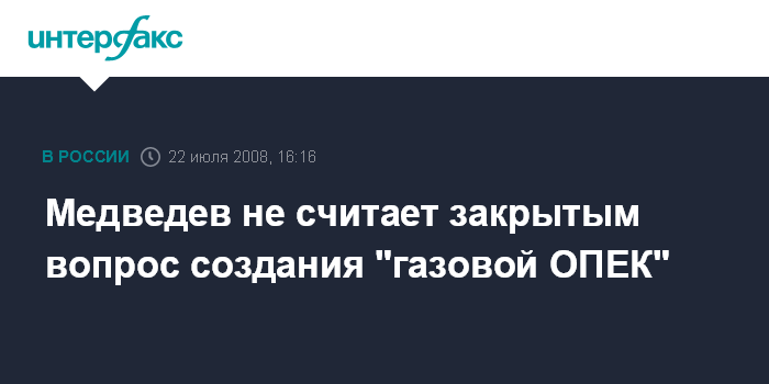 Барвиха (Московская область). 22 июля. ИНТЕРФАКС - Президент РФ Дмитрий Медведев считает, что вопрос о создании в газовой сфере организации, подобной ОПЕК, не закрыт.