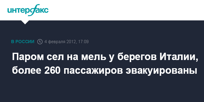 Рим. 4 февраля. INTERFAX.RU - Более 260 пассажиров были эвакуированы с парома "Шардон" после того, как он сел на мель у берегов Италии, сообщает в субботу агентство "Франс пресс".