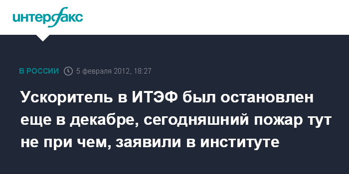 Москва. 5 февраля. INTERFAX.RU - Начальник ускорительной установки Института теоретической и экспериментальной физики (ИТЭФ) Николай Алексеев опроверг сообщения о том, что сегодняшний пожар якобы нанес серьезный ущерб учреждению, вынудив остановить ускоритель. "Ускоритель был отключен 25 декабря в плановом режиме на профилактику и поврежден в результате инцидента не был, так как не было открытого огня", - заявил Н.Алексеев "Интерфаксу".