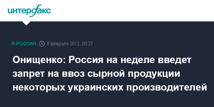 Москва. 6 февраля. ИНТЕРФАКС - Запрет на ввоз в Россию сырной продукции некоторых украинских производителей, которая не соответствует российским требованиям, будет введен на неделе, заявил глава Роспотребнадзора Геннадий Онищенко.