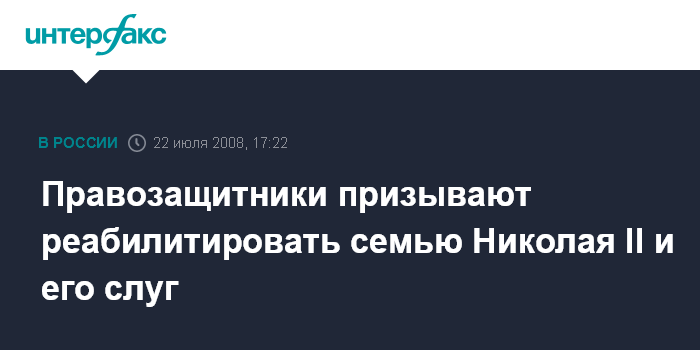 Москва. 22 июля. INTERFAX.RU - Лидеры ведущих российских правозащитных организаций недоумевают, почему семья последнего российского императора до сих пор не реабилитирована.