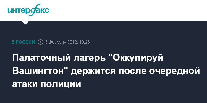 Вашингтон. 6 февраля. INTERFAX.RU - Американская полиция предприняла очередную попытку разогнать участников палаточного лагеря всемирной акции протеста Occupy, сообщила в понедельник американская газета The Washington Post.