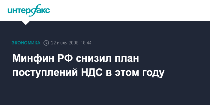Москва. 22 июля. INTERFAX.RU – Минфин РФ в июле снизил прогноз поступлений по налогу на добавленную стоимость (НДС) в 2008 г. до 1 трлн 214,5 млрд рублей, сообщил агентству "Интерфакс-АФИ" источник в министерстве.