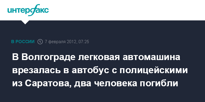 Ростов-на-Дону. 7 февраля. ИНТЕРФАКС-ЮГ - В ДТП с участием иномарки и автобуса с полицейскими в Волгограде погибли двое молодых людей, находившихся в автомобиле, сообщили агентству "Интерфакс-Юг" в правоохранительных органах региона.