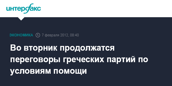 Брюссель. 7 февраля. INTERFAX.RU - Премьер Греции Лукас Пападимос и лидеры партий продолжат во вторник обсуждение новых мер бюджетной экономии, на которых настаивают Евросоюз и Международный валютный фонд в качестве условия получения новых кредитов.