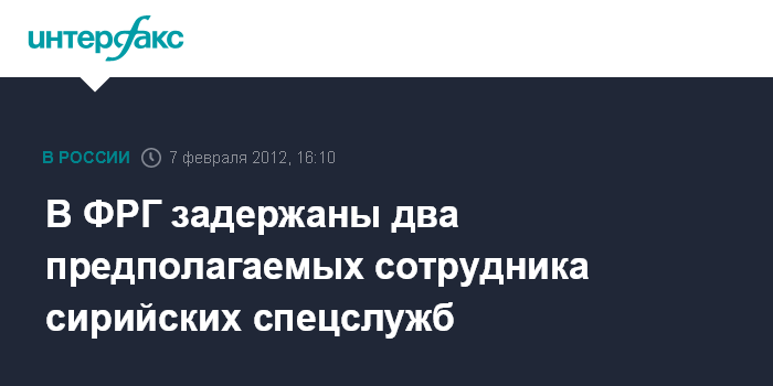 Берлин. 7 февраля. INTERFAX.RU - Федеральная прокуратура ФРГ объявила во вторник о задержании двух человек, подозреваемых в работе на спецслужбы Сирии.