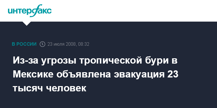 Москва. 23 июля. INTERFAX.RU - Мексиканские власти при поддержке местной полиции во вторник приступили к проведению эвакуации 23 тысяч человек из штата Тамаулипас, который расположен на северо-востоке Мексики.