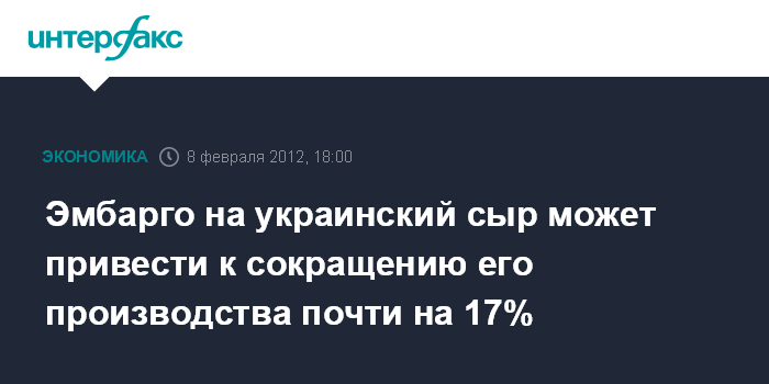 Киев. 8 февраля. INTERFAX.RU - Запрет Роспотребнадзором поставок сыров производства трех украинских предприятий может привести к сокращению выпуска этой продукции в текущем году в целом по Украине на 16,8% по сравнению с прошлым годом, или на 30 тыс. тонн, считает руководитель аналитического отдела консалтингового агентства ААА Мария Колесник.